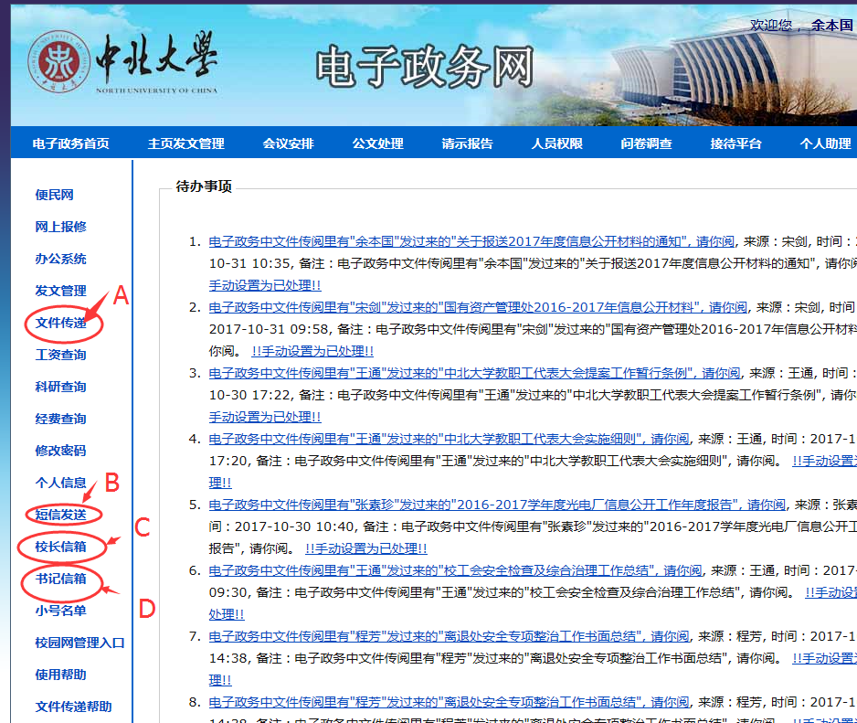 “校长信箱”、“文件传递”和“短信群发”功能都需要登录原【电子政务】系统,所以要使用这三个功能时,需要先登录。