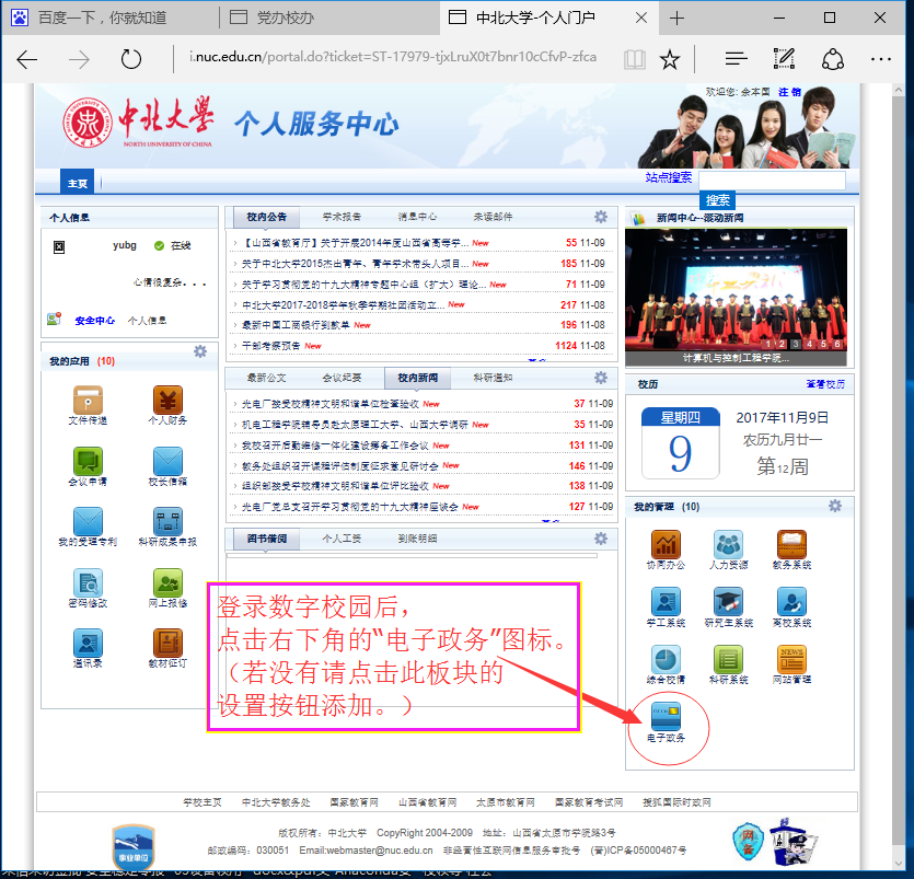 先登录数字校园,登录后在界面的右下角有一个“电子政务”图标,点击打开后,直接就进入了电子政务系统。