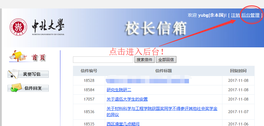 校长信箱的处理:从图二中选择C,进入校长信箱界面,点击右上角的“后台管理”进入信箱处理信件。